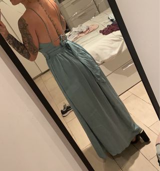 Vestido largo, ideal para bodas o eventos especiales. Es un modelo nuevo con un diseño elegante. - Color verde azulado. - Espalda descubierta con tiras. - Lazada en la cintura.