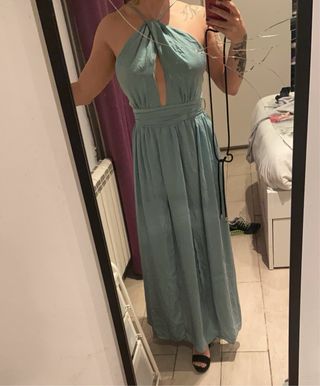 Vestido largo de tirantes regulables con escote pronunciado y abertura lateral. - Diseño elegante y favorecedor. - Ideal para eventos y bodas. - Etiqueta interior con detalles de la marca y talla.