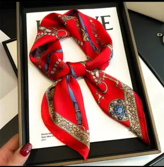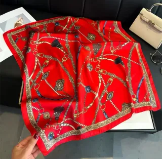 Elegante pañuelo de seda con un llamativo estampado. - Diseño con cadenas y detalles dorados. - Tacto suave y sedoso. - Versátil para usar en cuello, bolso o cabello.