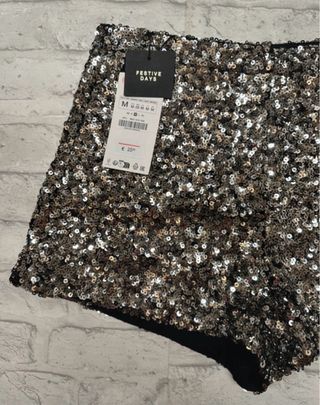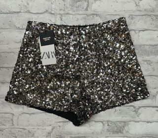 Shorts de lentejuelas en color negro y plateado de la marca Zara.A pesar de ser talla M servirían para una talla 36/38 ya que no tallan muy grandes. Cierre frontal de broche y cremallera metalica invisible, forro interior y tiro alto.Estan completamente nuevos con etiquetas listos para estrenar Medidas: Largo 30,5cm x ancho de cintura 36,5cm x ancho de cadera 44cm Composición: 95% poliéster 5% elastano 🚚ENVÍOS EN MENOS DE 24H🚚