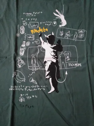 Camiseta de manga corta con un diseño gráfico original de Tio Pepe. - Ilustración con silueta de diablo y elementos relacionados con tapas y cócteles. - Estampado blanco y amarillo sobre fondo verde. - Detalle de texto Pinchita y Tio Pepe.