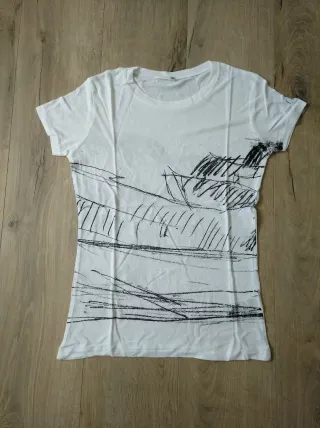 Camiseta blanca de manga corta con un diseño abstracto en negro. - Estampado de líneas y trazos. - Cuello redondo. Disponibles 3 unidades.