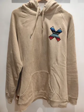 Sudadera con capucha de la marca Blue Banana en color beige. Presenta un distintivo logo en forma de X con un diseño geométrico y colorido en el pecho. - Logo de la marca en forma de X. - Diseño geométrico y multicolor en el logo. - Capucha con cordones. - Bolsillo frontal tipo canguro.