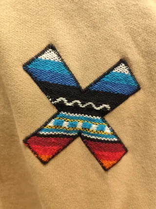 Sudadera con capucha y cremallera completa. Estampado étnico con motivos geométricos y de hojas. Forro interior suave y cálido. Cordones ajustables en la capucha. Talla XL. NUEVA A ESTRENAR.