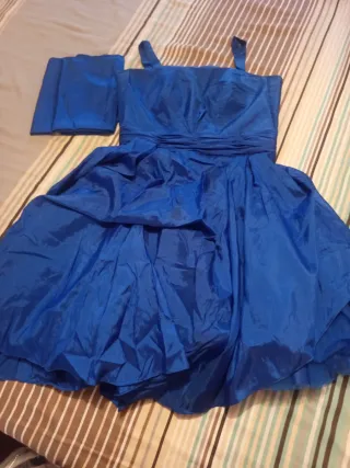 Elegante vestido azul con un diseño moderno y favorecedor. Ideal para eventos especiales. - Tejido satinado con caída. - Cintura marcada con drapeado. - Falda con volumen y capas.