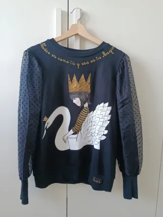 Sudadera de la marca Anabel Lee con un diseño único. - Estampado de cisne con corona. - Inscripción Nadie es como tú y esa es tu magia bordada en dorado. - Mangas de tul con topos.