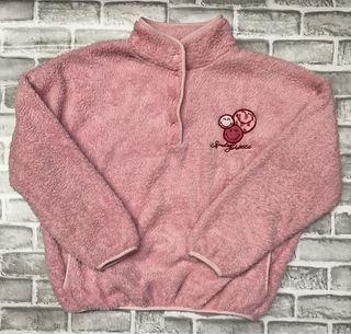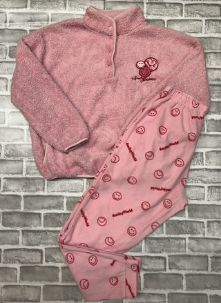 Conjunto pijama dos piezas polar con estampado de caritas de smile en color rosa palo y rosa fucsia.Parte de arriba de borreguito,manga larga y cuello alto con corchetes y parte de abajo con goma elástica en la cintura y en los puños del bajo del pantalón.A pesar de ser una talla L serviría tambien para una talla M (36-38) ya que no talla muy grande.Usado un par de veces se encuentra en perfecto estado,el único inconveniente es la pequeña marca de lejía que tiene en el bajo de la pierna izquierda (de ahí su precio) Medidas: Parte de arriba Largo 62cm x ancho de sisa a sisa 66,5cm Parte de abajo Largo 98cm x ancho de cintura 36cmx48