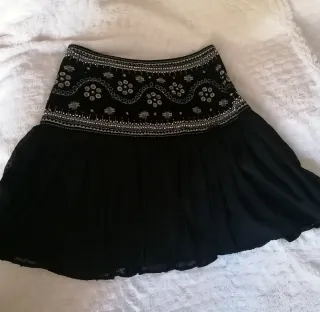 Falda negra de la marca ZAITEGUI con diseño de bordado y pedrería muy en la cintura. - Cintura adornada con bordados y pedrería. - Diseño floral y geométrico. - Falda con vuelo. Tiene forro