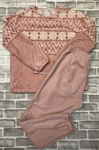 Conjunto pijama de dos piezas polar en colores rosa pastel rosa oscuro y blanco de la marca Women Secret. El tejido es muy suave y agradable al tacto, ideal para estar cómoda y calentita en casa.La parte de arriba tiene un diseño con estampado geométrico y la parte de abajo es rosa bebe lisa con cintura y puño elástico.Usado una sola vez se encuentra en perfecto estado Medidas: Parte de arriba Largo 59,5cm x ancho de sisa a sisa 58cm Parte de abajo Largo 102cm x ancho de cintura 35cm x ancho de cadera 49cm Composición: 100% Poliester 🚚ENVIOS EN MENOS DE 24H🚚