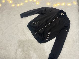 Chaqueta tipo bomber marca Zara en color negro de raso. Con cremalleras, tachuelas y letras lettering. Talla: M mujer En muy buen estado. Súper estilosa y combinable con todo tipo de outfit. Todas las prendas se envían lavadas 🧼🫧. Hago LOTES y PACKS, pregúntame! ❗️ Echa un vistazo a mi armario, ropa muy barata y súper chula, y más cositas!!! 🤩😎👀✨💕