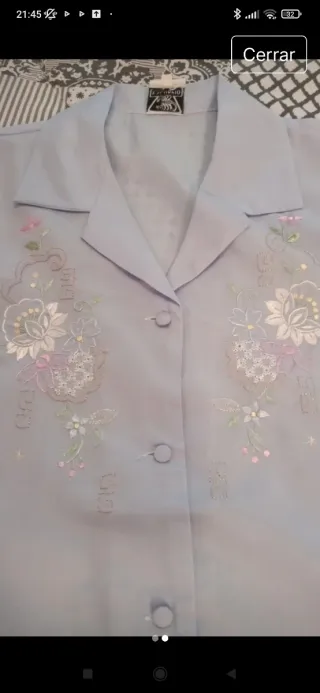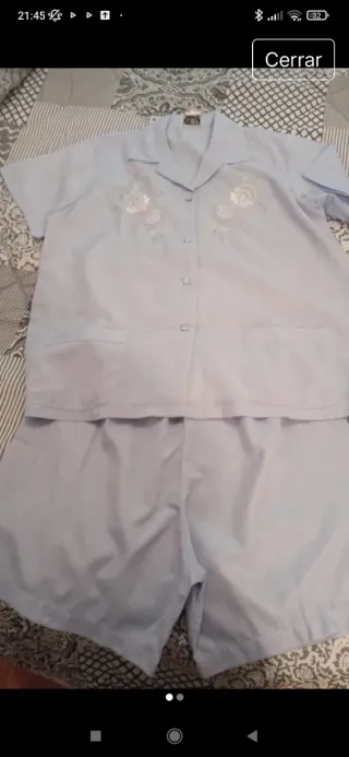Conjunto de pijama de satén en tono azul celeste. Incluye camiseta y pantalón corto. - Camiseta con cuello camisero y botones. - Detalle de bordado floral en la parte delantera de la camiseta. - Dos bolsillos en la parte delantera de la camiseta. - Pantalón corto con cintura elástica.