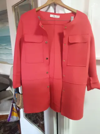 Elegante abrigo de la marca Mango en color rojo. - Diseño con cuello camisero. - Bolsillos frontales con botón. - Tejido texturizado.
