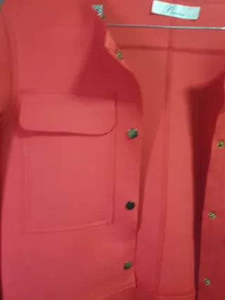 Abrigo de neopreno en color coral, perfecto para la primavera. Diseño moderno y versátil. - Cuello redondo. - Cierre de botones a presión dorados. - Dos bolsillos de solapa en la parte delantera. - Puños con detalle. - Largo hasta la cadera.