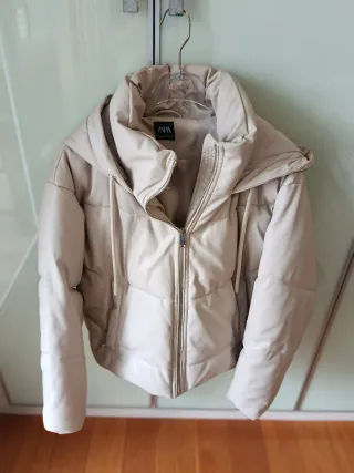 Plumífero de la marca Zara en color beige. - Diseño acolchado. - Capucha integrada. - Cierre de cremallera frontal. - Cordones ajustables en la capucha.
