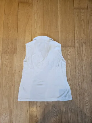Camiseta sin mangas de color blanco, con cuello en V y detalle de botones. - Diseño sin mangas. - Cuello tipo polo con escote en V. - Etiqueta de la marca visible en el cuello.