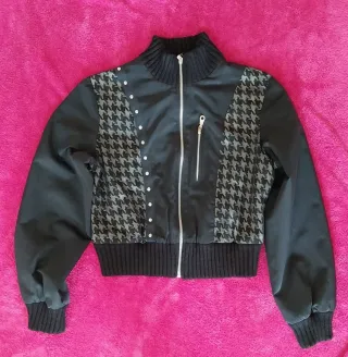 Cazadora de estilo deportivo con un diseño moderno y llamativo. - Paneles con estampado de pata de gallo en gris. - Detalles de tachuelas plateadas. - Cuello alto de canalé. - Cremallera frontal. - Puños y bajo de canalé. - Talla T1 - Marca: Planete Interdite