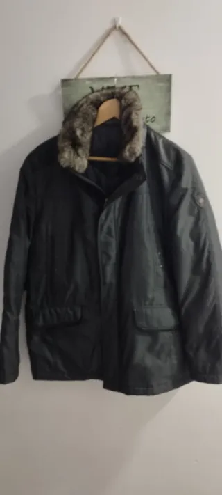 Abrigo de la marca Florentino en color negro y talla L. Presenta un diseño elegante y moderno. - Cuello con detalle de pelo. - Cierre de cremallera. - Dos bolsillos frontales con solapa. - Detalle de logo en manga.