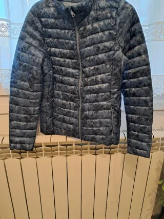 Cazadora acolchada con un diseño moderno y llamativo. Perfecta para añadir un toque de estilo a tu look. - Estampado abstracto en tonos azules y grises. - Cierre de cremallera frontal. - Cuello redondo.
