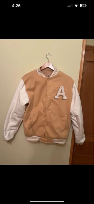 Chaqueta estilo universitario de la marca Aeropostale. Presenta un diseño clásico con cuerpo en color beige y mangas en blanco. - Cierre de botones a presión. - Cuello y puños con detalles de rayas. - Parche con la letra A en el pecho.