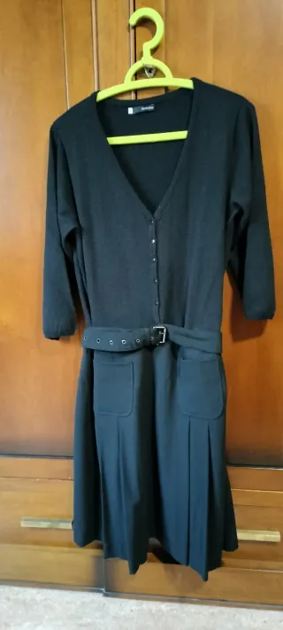 Vestido de punto de la marca Escorpión. - Cuerpo de 85% lana y falda de tela, lleva un cinturón. - Efecto dos piezas - Diseño de manga francesa. - Cuello en V. - Cierre de botones. - Bolsillos delanteros. - Falda con pliegues "de tela"