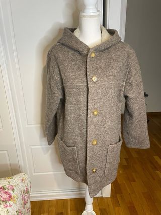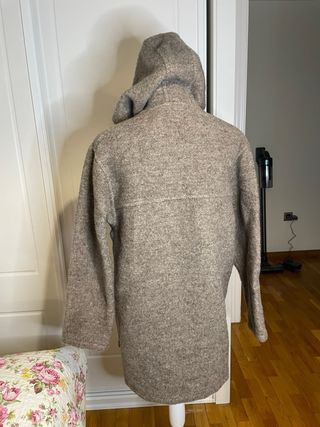 Calidad Premium: Abrigo confeccionado en pura lana virgen de alta calidad, conocida por su calidez y durabilidad. • Diseño: Estilo rústico y atemporal tipo "Duffle coat". Incluye capucha fija y cierre frontal con botones de madera/cuerno (tipo trenca). • Funcionalidad: Dispone de dos amplios bolsillos laterales abiertos. • Sostenibilidad: hessnatur es una marca alemana líder en moda ética y ecológica. • Corte: Ajuste cómodo y relajado (oversized), ideal para llevar con capas debajo. Tiene una pequeña imperfección de la lana foto última Talla S da a M Medidas Sisa 50 cm Largo 80 cm Precio original 350 euros