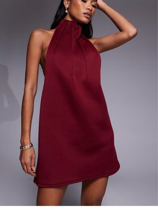 Precioso vestido corto de la línea ASOS DESIGN en un elegante color burdeos. Destaca por su cuello alto estilo halter con detalle de pliegues frontales y una espectacular espalda totalmente abierta, lo que lo hace ideal para eventos, fiestas o cenas especiales. • Corte: Línea A (suelto y cómodo). • Material: Tejido de neopreno ligero/punto denso (95% Poliéster, 5% Elastano) que mantiene muy bien la forma y tiene un tacto suave. Marca Asos colección actual precio 39,99 euros Talla 42 Medidas Cintura 40 ,estira a 42 y 44 Largo 88 cm