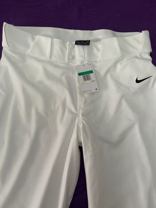 Pantalones de béisbol de la marca Nike en color blanco. Diseñados para la comodidad y el rendimiento en el campo. - Cintura con trabillas para cinturón. - Cierre de botón y cremallera. - Logo de Nike bordado.
