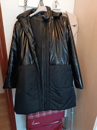 Cazadora negra brillante con capucha. Marca akino.