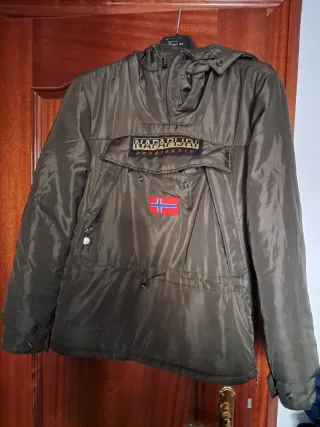 Chaqueta estilo anorak de la marca Napapijri. - Color verde oliva. - Diseño con capucha. - Bolsillo frontal grande. - Cierre de cremallera parcial. - Detalle de parche con bandera. - Cordón ajustable en la cintura.