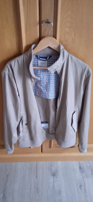 Chaqueta de la marca Pepe Jeans en color beige. Presenta un forro interior a cuadros. - Cierre de cremallera. - Bolsillos laterales con botón. - Cuello redondo.