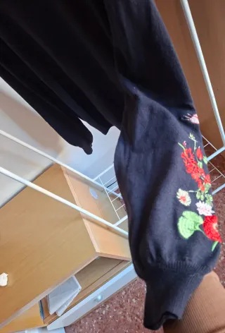 Jersey de punto de la marca Desigual con un diseño llamativo. - Manga larga abullonada. - Detalle bordado de flores en las mangas. - Cuello redondo. Usado pocas veces.tiene bastantes bolitas el tejido(ver foto)