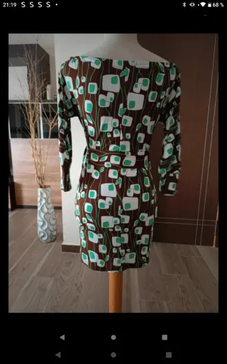 Precioso vestido mini de licra, ideal para cualquier ocasión. Es de manga tres cuartos y tiene un corte entallado que favorece la figura. Se abrocha con una hebilla en la cintura. - Diseño estampado con motivos geométricos en tonos marrones y verdes. - Tejido suave y elástico. - Perfecto estado.