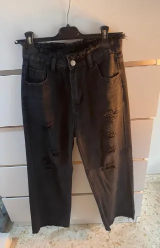 Pantalón vaquero negro con un diseño moderno y desgastado. - Cintura con acabado deshilachado. - Detalle de rotos en las perneras. - Bajo del pantalón con acabado deshilachado.