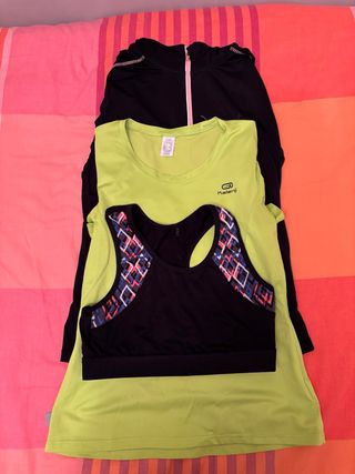Conjunto deportivo de tres piezas. - Chaqueta deportiva negra con cremallera, marca lefties, talla 38 - Camiseta deportiva verde, marca kalenji, talla XS - Sujetador deportivo negro con estampado, marca lefties, talla S