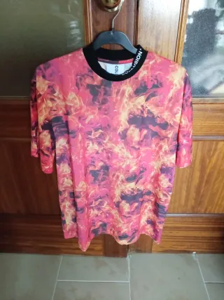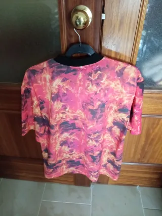 Camiseta con un llamativo estampado de llamas en tonos rojos y naranjas. El cuello es negro y tiene el logo de la marca. Tejido elástico. - Diseño de llamas vibrante. - Cuello redondo negro. - Logo de COLLUSION en el cuello.