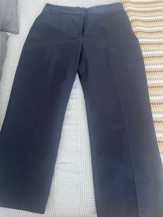 Pantalón de vestir de la marca K Woman con un diseño de rayas sutiles. - Corte recto. - Cierre de botón y cremallera. - Dos bolsillos delanteros y dos traseros. - Tejido con caída. - Está en buen estado general salvo en el bajo detrás , ver foto