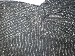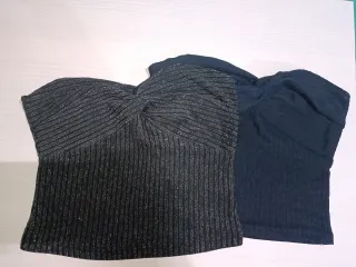 Dos tops bandeau con un diseño elegante y moderno. Uno de ellos tiene un acabado brillante con detalles plateados. - Diseño bandeau. - Tejido con acabado brillante y rayas plateadas. - Tejido con rayas.