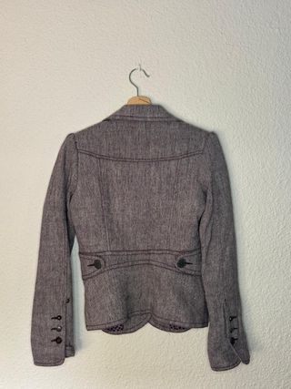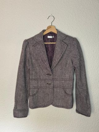 Blazer de mujer de la marca Bershka, talla S, en un elegante tono gris jaspeado. Diseño entallado que realza la silueta, ideal tanto para looks formales como casuales. Cuenta con: Cierre frontal de dos botones Solapas clásicas Dos bolsillos delanteros Costuras decorativas que aportan estructura Forro interior con estampado geométrico, muy original y cuidado Tejido agradable y cómodo, perfecto para entretiempo o días frescos Se encuentra en muy buen estado, sin manchas, roturas ni desperfectos visibles. Ideal para oficina, eventos informales o para combinar con vaqueros y camiseta para un look más casual.
