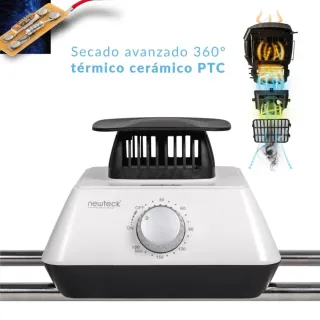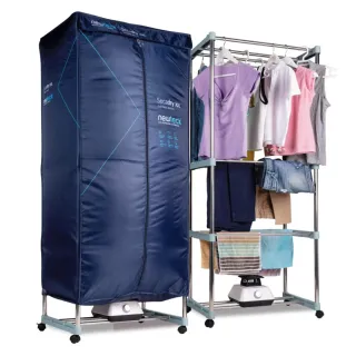 Secador de ropa portátil de la marca Newteck, ideal para secar prendas de forma rápida y eficiente. Su diseño compacto lo hace fácil de mover y almacenar. - Cubierta de tela azul. - Estructura de metal plateado. - Base con unidad de secado.