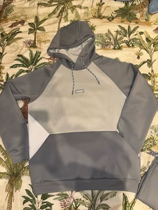 Sudadera con capucha de la marca McKenzie. - Diseño en bloques de color gris y blanco. - Bolsillo frontal tipo canguro. - Cordones ajustables en la capucha. El gris oscuro tiene como un tono azulao. También disponible el pantalón del mismo chandal en talla M USADO 1 VEZ