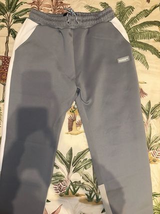 Pantalón de chándal con un diseño moderno y detalles en blanco. el gris oscuro tiene como un tono azulao. - Cintura elástica con cordón. - Logo de la marca en la parte delantera. - Paneles laterales en contraste. También disponible la sudadera del mismo chandal en talla XL. USADO SOLO UNA VEZ