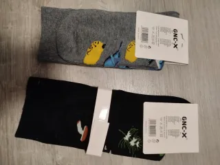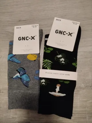 Pack de dos pares de calcetines de la marca GNC-X. Nuevos - Talla 40-46. - Un par con estampado de pájaros y limones sobre fondo gris. - Otro par con estampado de hojas y un hongo sobre fondo negro. - Fabricados en algodón de primera calidad.