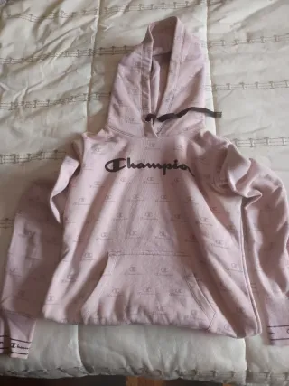 Sudadera con capucha de la marca Champion en color rosa. Presenta un diseño con el logo de la marca repetido por toda la prenda. - Capucha con cordones. - Bolsillo frontal tipo canguro. - Puños y bajo elásticos.