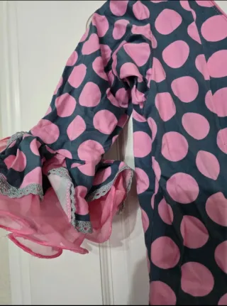 Traje de flamenca con un llamativo estampado de lunares. - Diseño con volantes en falda y mangas. - Mangas acampanadas con volantes. - Adornos de volantes en rosa y gris. - Tiene bolsillo Manga 38 cm Contorno de pecho 80 cm Cintura 70 cm Cadera 94 cm Largo 1,40 cm