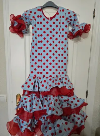 Traje de flamenca para niña azul claro con lunares blancos. Marca Roney - Diseño con volantes en mangas y falda. - Adornos de puntilla y pasacintas. - Color azul con detalles en rojo.