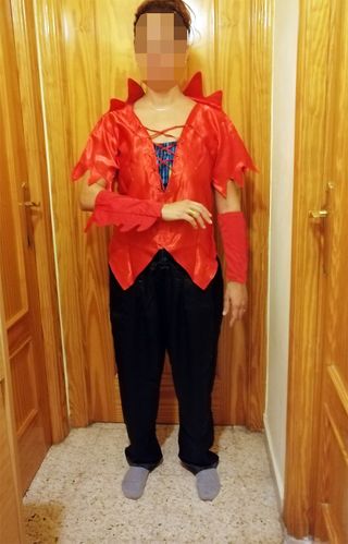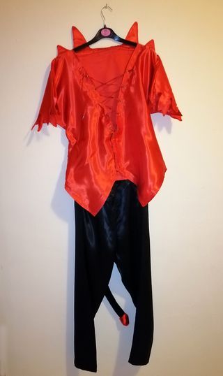 Disfraz de diablo con detalles llamativos. - Parte superior roja con cordones. - Mangas rojas. - Pantalones negros.