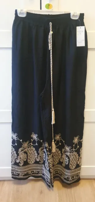 Pantalones largos de color negro con un bonito bordado dorado en el bajo. Tienen cintura elástica y cordón. - Diseño con bordado floral. - Cordón decorativo con borlas.