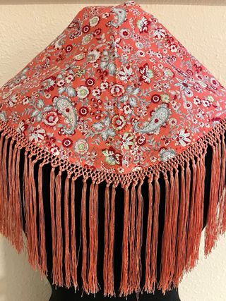 Precioso matoncillo de flamenca para niña con un bonito estampado floral. - Diseño triangular. - Adornado con flecos largos y detalle de crochet. - Base en tono coral con motivos florales en blancos y rojos Mantoncillo de niña . Largo parte sin flecos 79cm Largo espalda , sin contar los flecos 27cm Largo del enrejado y los flecos 15cm