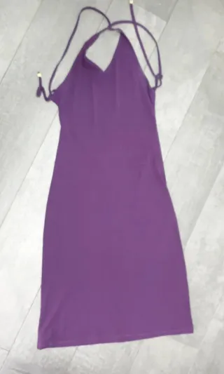 Vestido morado con un diseño elegante y escote en la espalda. Su tejido tiene un ligero brillo que lo hace especial. - Diseño con tirantes. - Largo hasta la rodilla.
