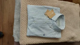 Camisa de manga larga con un diseño de rayas finas en tonos azules y blancos. Presenta un cuello clásico y cierre de botones. - Diseño de rayas verticales y horizontales. - Botones frontales. - Logo de la marca en la etiqueta interior.